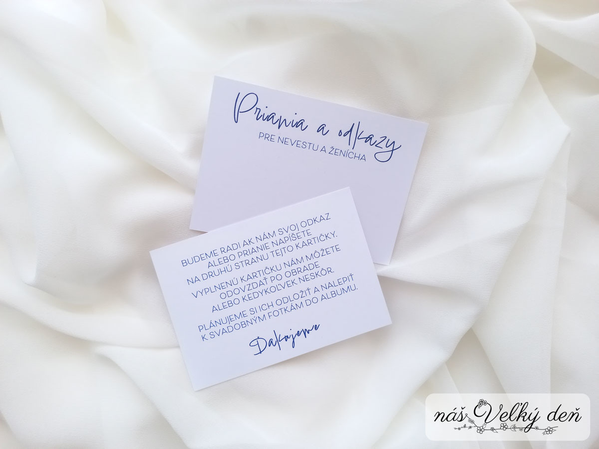 Kartička pre priania a odkazy je výbornou náhradou klasických svadobných telegramov. Najmä ak si ich chcete odložiť k fotkám do albumu, knihy hostí alebo krabičky. Môžete ich priložiť priamo k svadobným oznámeniam do obálky, alebo ich nechať voľne dostupné počas svadobnej zábavy aby ich hostia mohli vypísať priamo na mieste. Neskôr ich už len zozbierate a odložíte.
