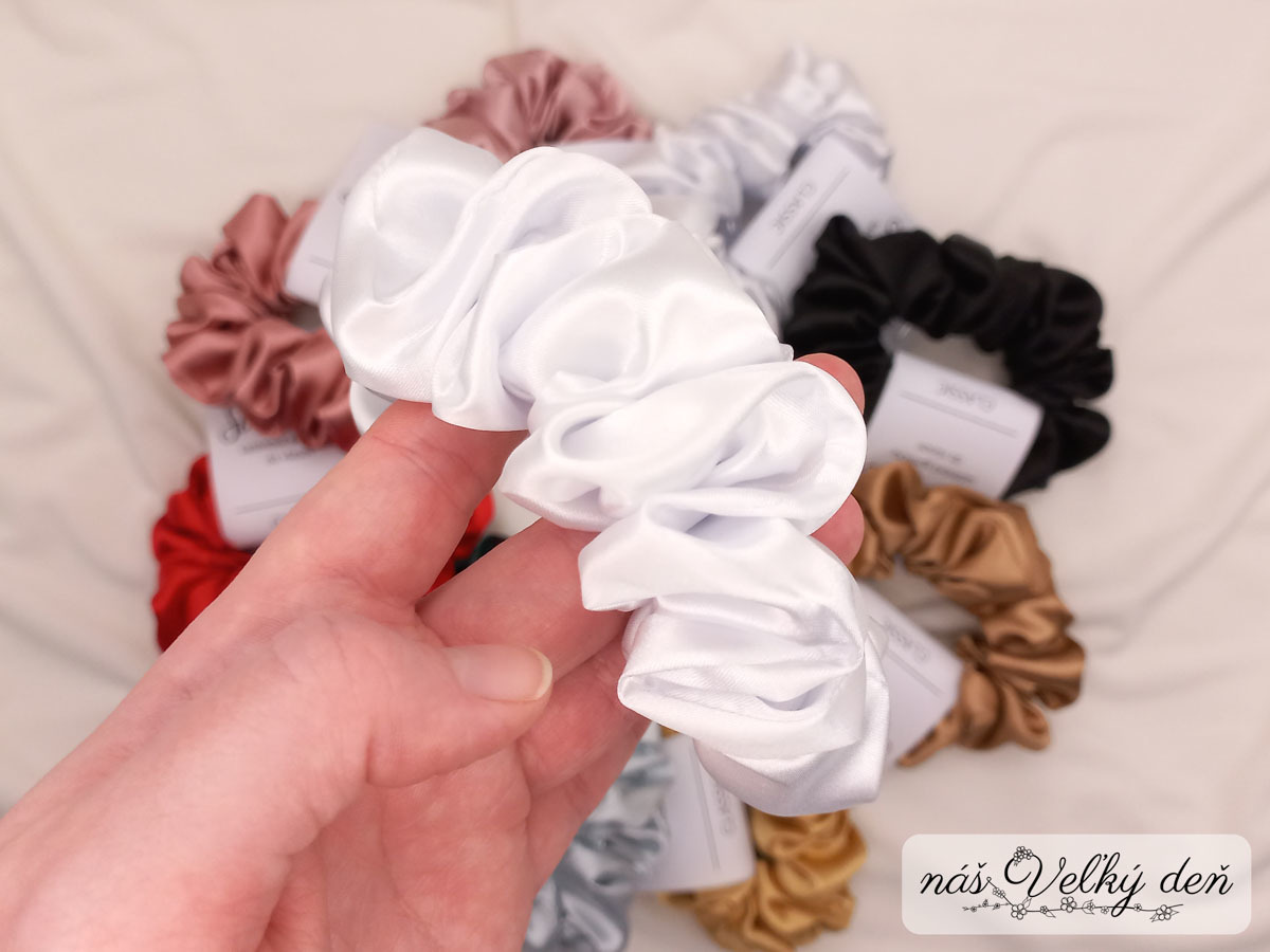 - výhody: jemná k vlasom - neťahá a neláme ich tak ako klasické gumičky, je možné ju nosiť ako klasickú gumičku, alebo ako ozdobu (napr. na dotvorenie účesu),