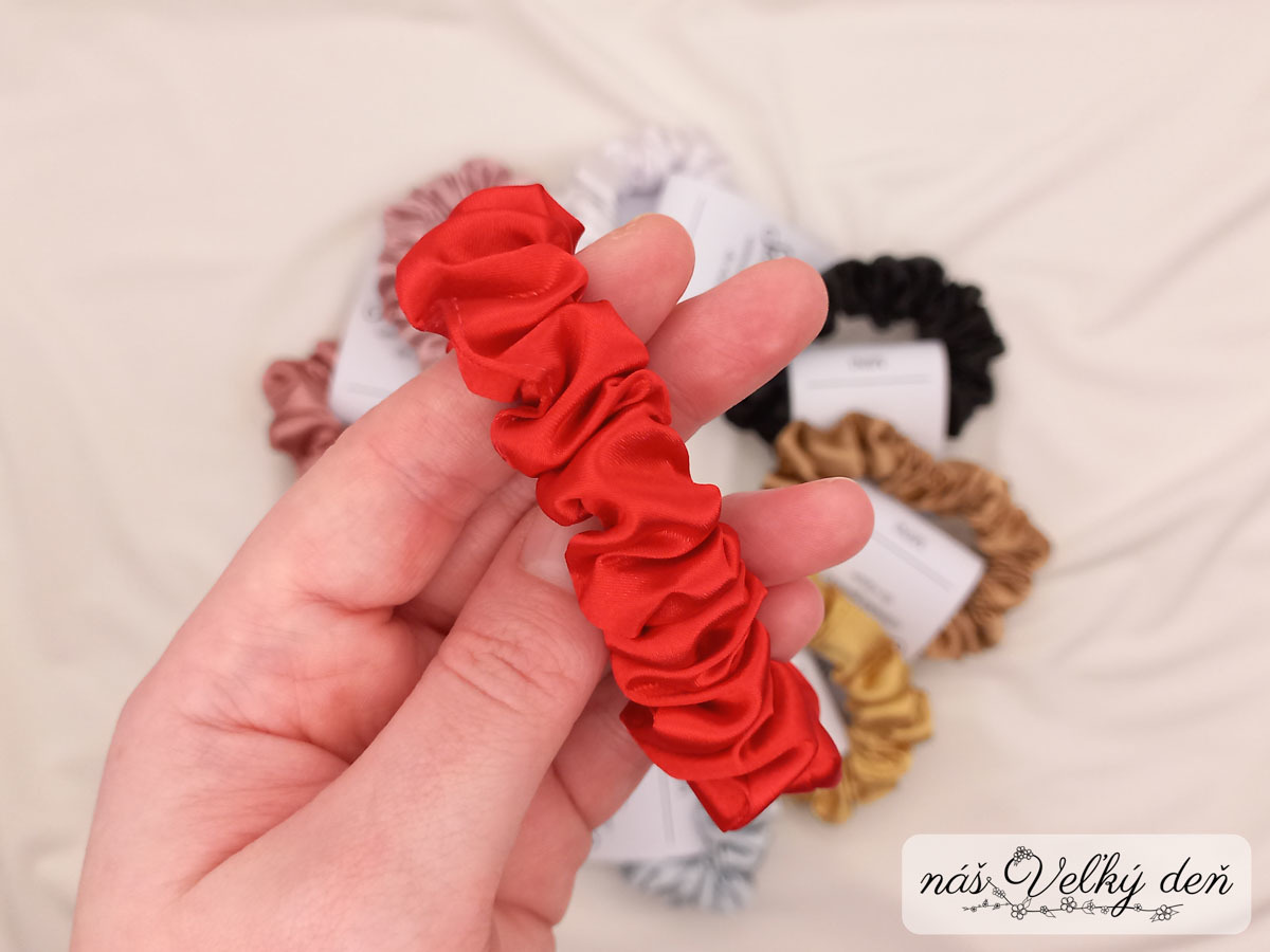 - vnútorná gumička: 1 cm široká pevná guma, možno ju obmotať 2-3 krát okolo vlasov,