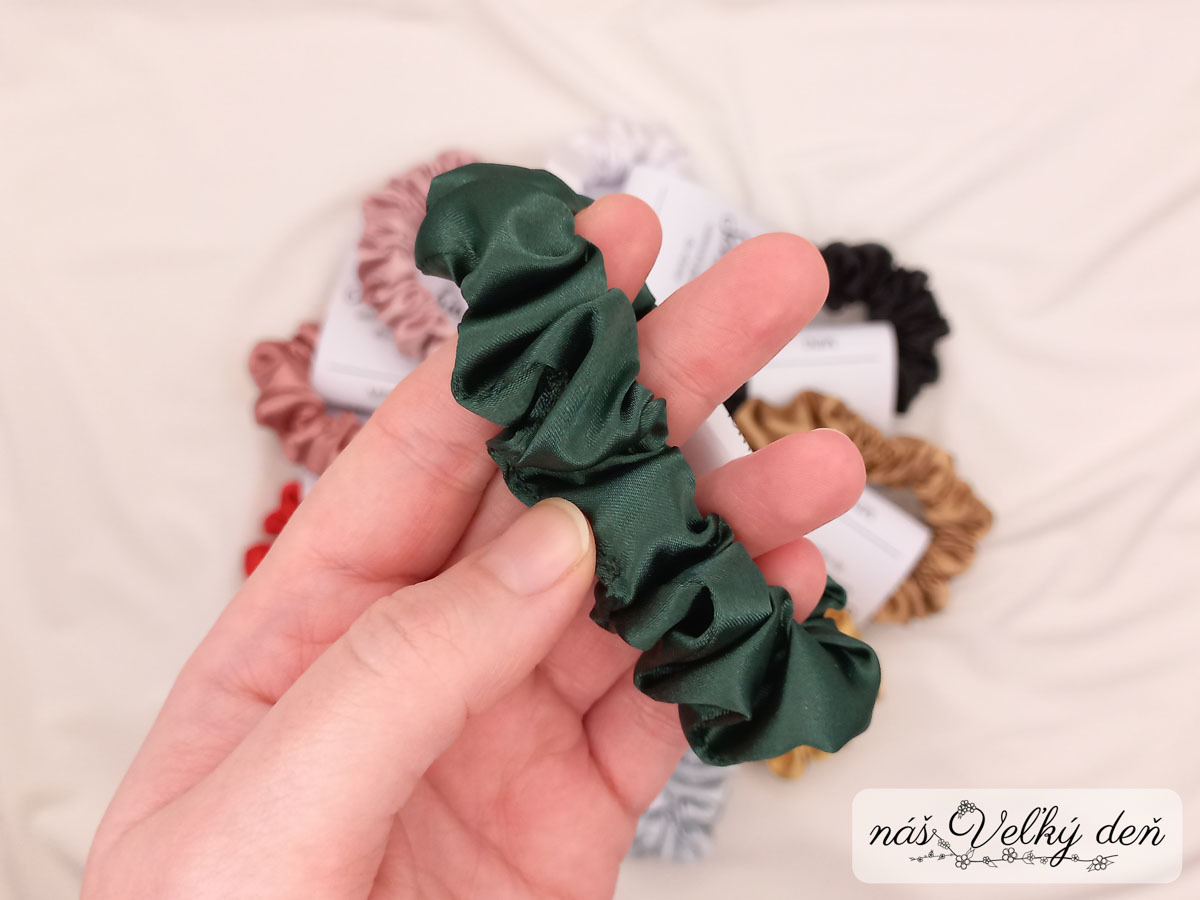 - výhody: jemná k vlasom - neťahá a neláme ich tak ako klasické gumičky, je možné ju nosiť ako klasickú gumičku, alebo ako ozdobu (napr. na dotvorenie účesu),