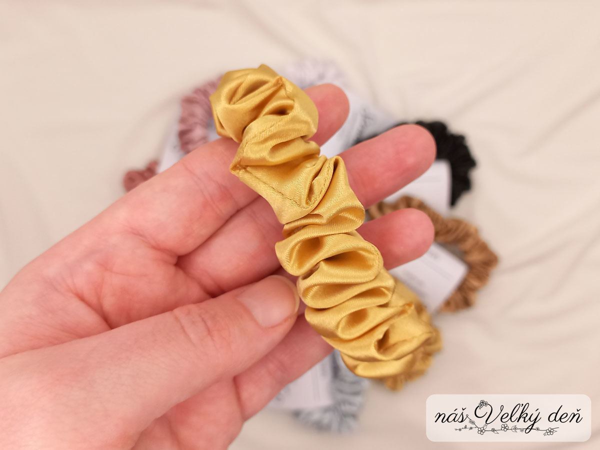 - výhody: jemná k vlasom - neťahá a neláme ich tak ako klasické gumičky, je možné ju nosiť ako klasickú gumičku, alebo ako ozdobu (napr. na dotvorenie účesu),