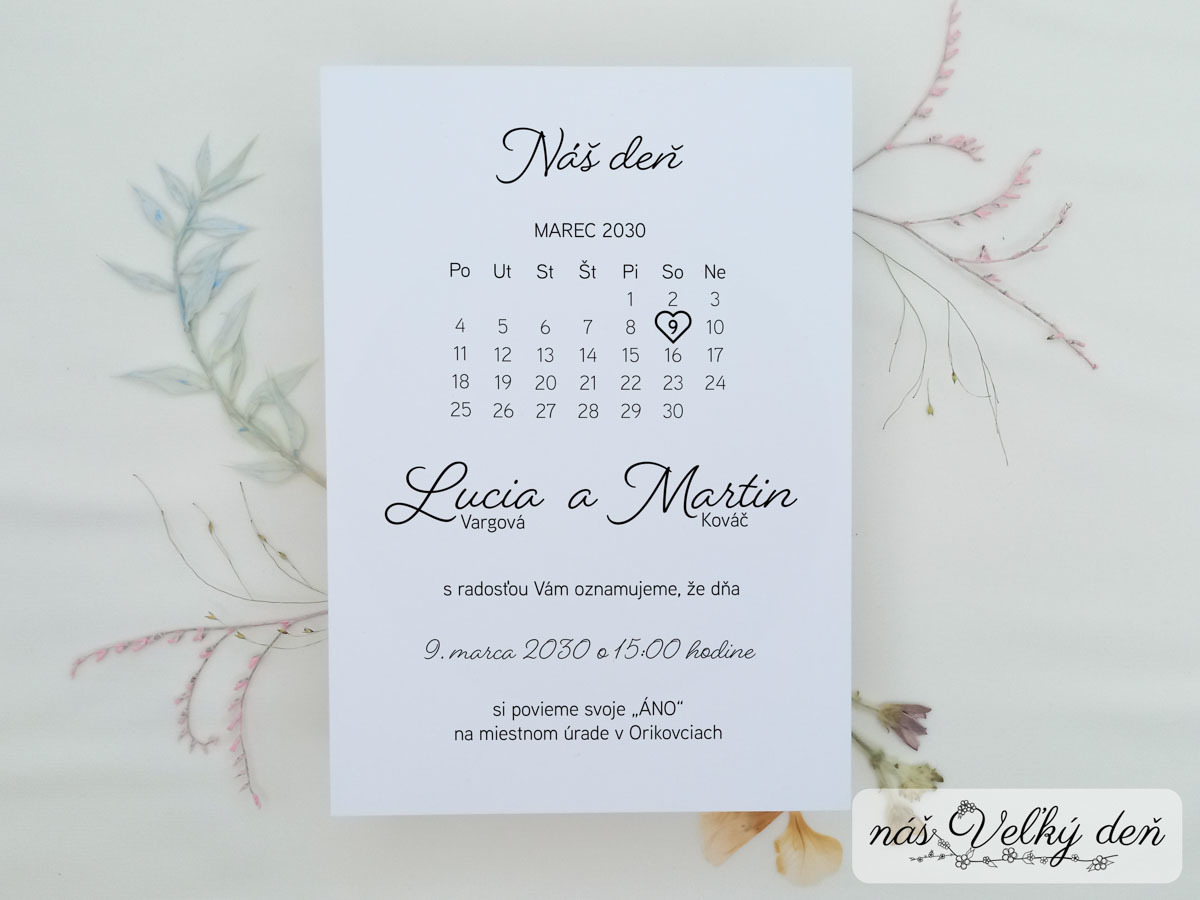 Ak vás neoslovili kvety, ale chcete aby vaše svadobné oznámenie bolo niečím ozvláštnené, tak tento dizajn je pre vás. Dizajn s jednoduchým textom a váš svadobný deň zvýraznený v malom kalendáriku daného mesiaca pôsobí moderne, ale nie je prehnaný.