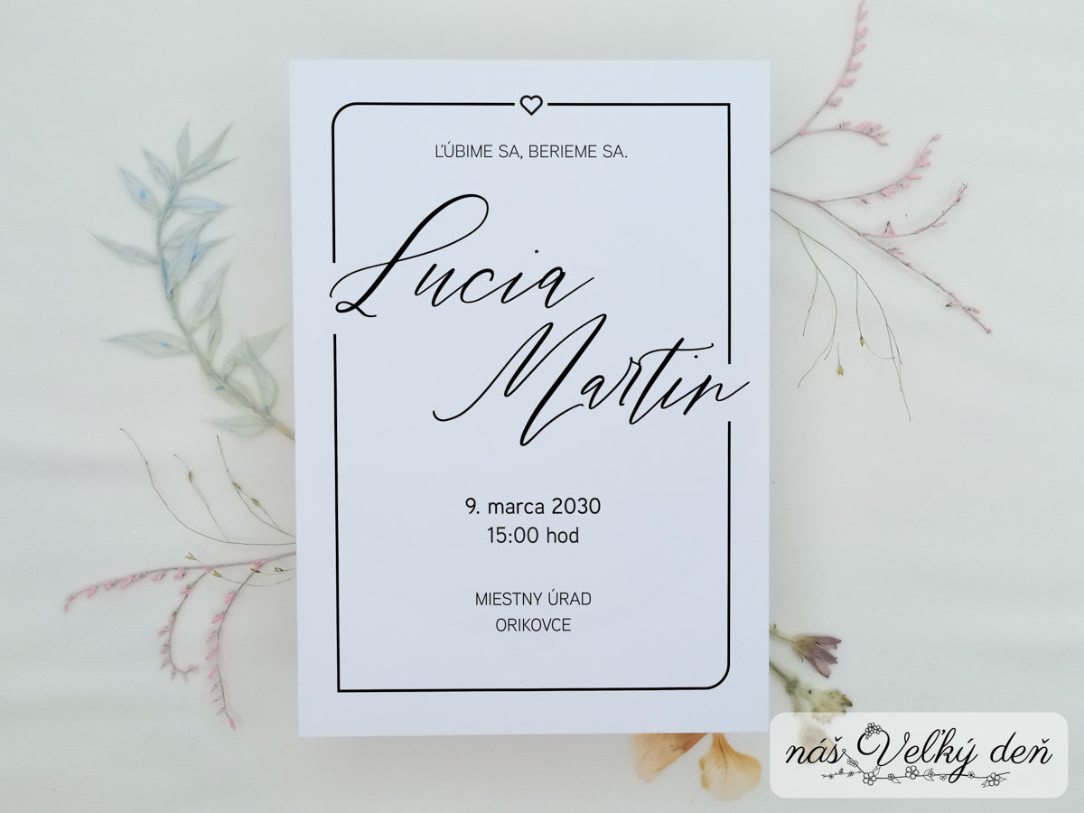 Jednofarebné, ale zároveň hravé svadobné oznámenie. Ozdobou tohto oznámenia sú samotné mená snúbencov písané väčším ozdobným písmom v kombinácii s jemným rámikom.